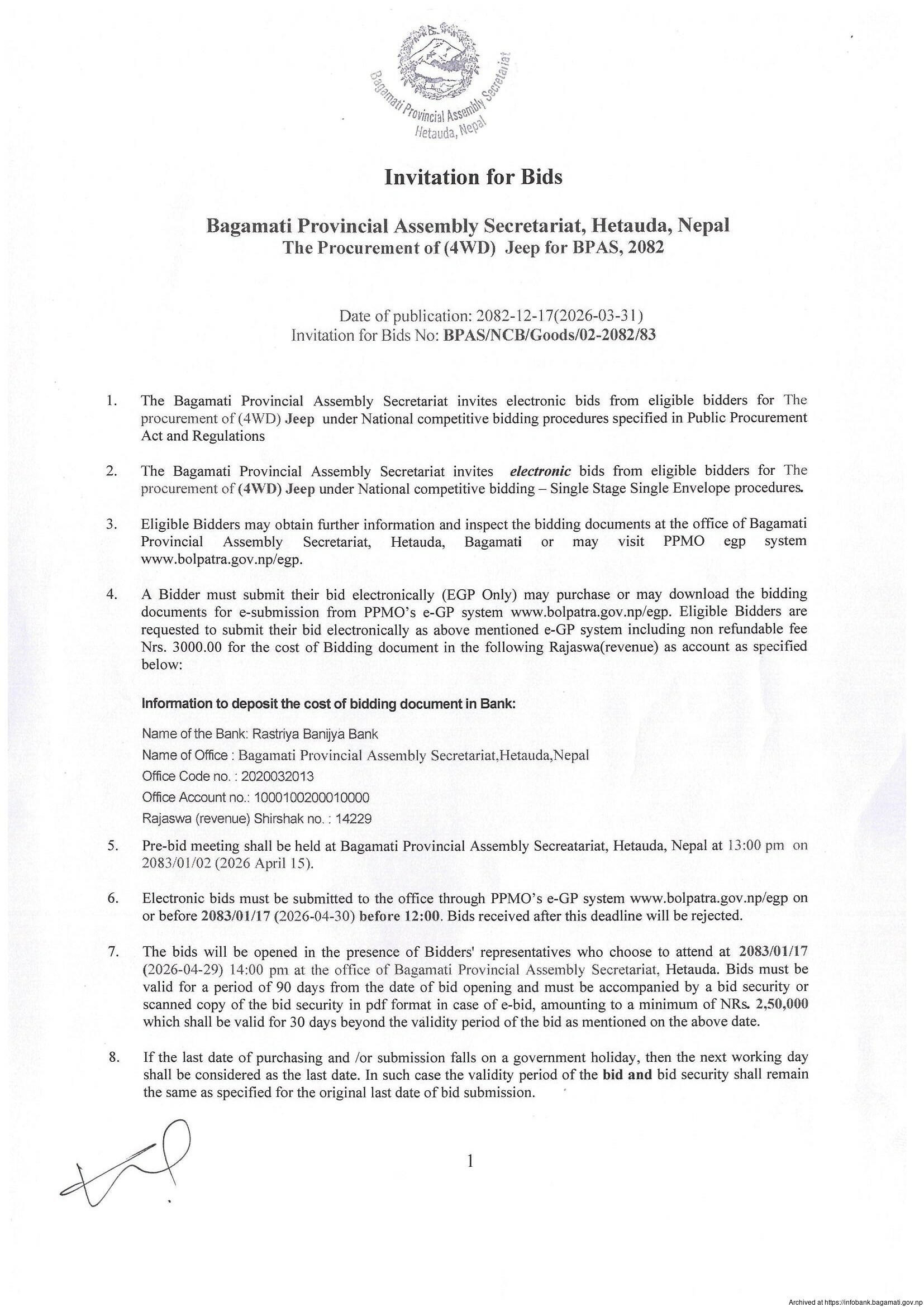 The Procurement of (4WD) Jeep for BPAS, 2082